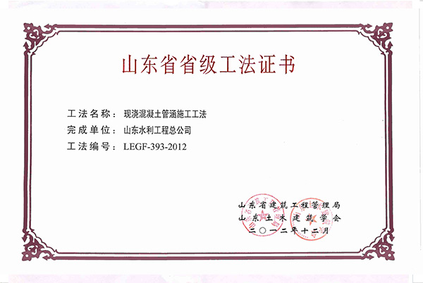 星空在线登录官网“现浇混凝土管涵施工工法”被评为2012年山东省省级工法