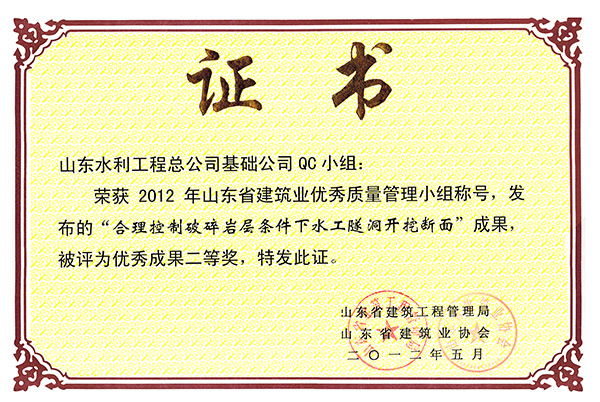 星空在线登录官网“合理控制破碎岩层条件下水工程隧洞开挖断面”等两项成果荣获2012年山东省建筑业优秀质量管理优秀成果二等奖