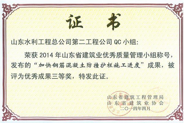星空在线登录官网“加快钢筋混凝土防撞护栏施工进度”荣获2014年山东省建筑业优秀质量管理优秀成果三等奖