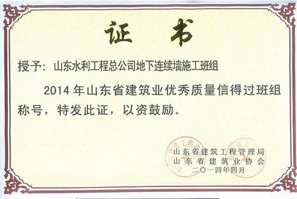 星空在线登录官网“地下连续墙施工班组”荣获2014年山东省建筑业优秀质量信得过班组称号