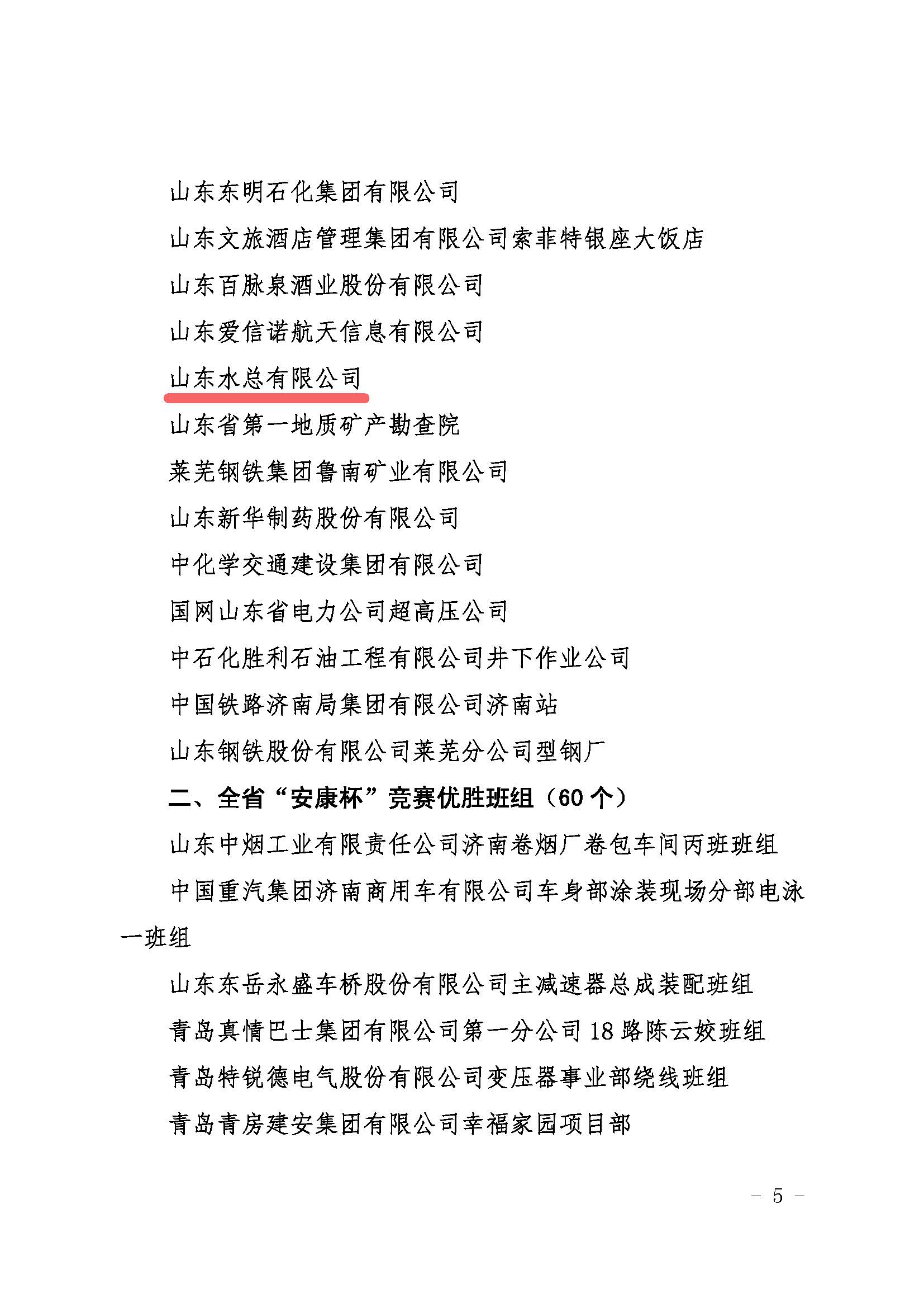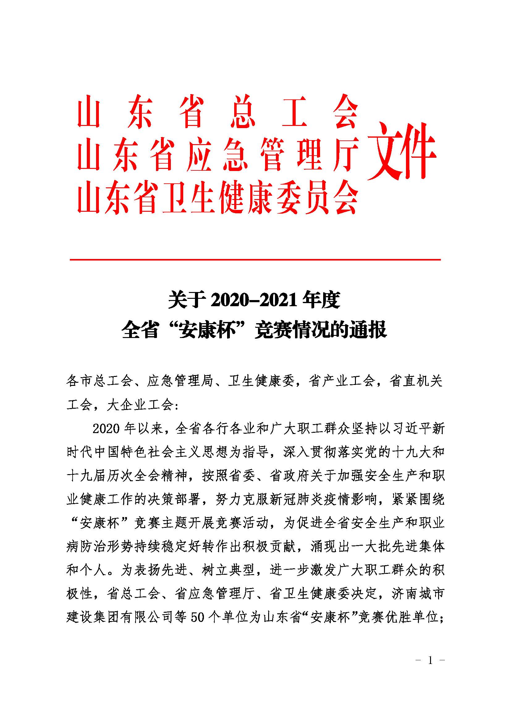 近日,山东省总工会、山东省应急管理厅和山东省卫生健康委员会联合印发文件,通报了2020-2021年度全省“安康杯”竞赛活动结果,山东水总有限星空在线登录官网荣获全省“安康杯”竞赛优胜单位称号。