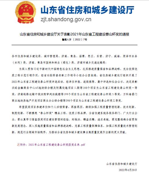 星空在线登录官网两项工程荣获2021年度“山东省工程建设泰山杯奖”