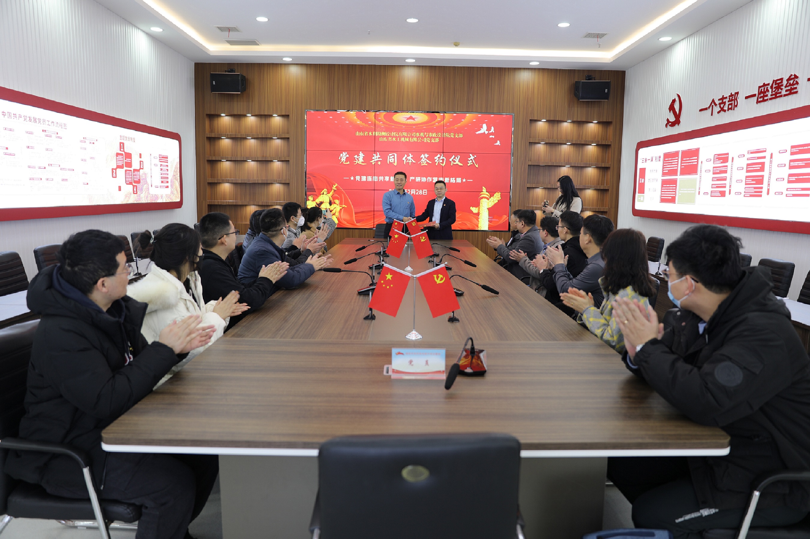 为深入贯彻党的二十大精神,以“党建链”助力产业链,形成“资源共享、优势互补、双相促进、共同提高”的共建新格局,2月28日水工机械星空在线登录官网党支部与山东省水利勘测设计院有限星空在线登录官网水机与市政设计院党支部在曲阜党性教育基地举行“党建共同体”签约仪式,共同绘制党组织结对共建发展蓝图。