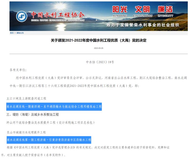 近日,中国水利工程协会发布《关于颁发2021-2022年度中国水利工程优质(大禹)奖的决定》,我星空在线登录官网参建的南水北调东线第一期工程济南~引黄济青段济南市区段输水工程和南水北调东线一期南四湖~东平湖段输水与航运结合工程邓楼泵站工程荣获此项殊荣。
