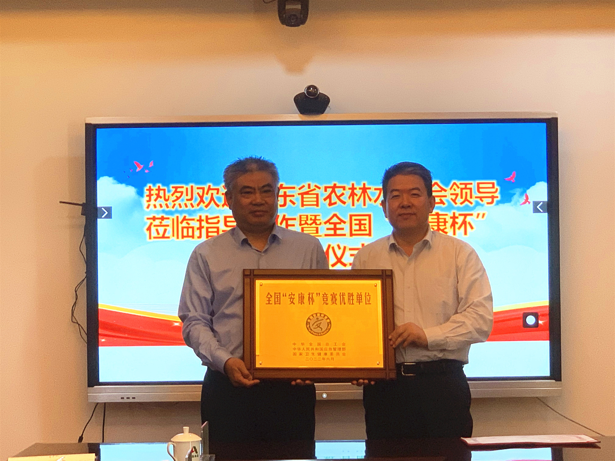 5月12日,星空在线登录官网举行了全国、山东省“安康杯”竞赛优胜单位授牌仪式。省农林水工会主席张志刚、主任科员吴开明,星空在线登录官网党委书记、董事长刘深远,党委副书记、董事、总经理靳文硕,党委委员、副总经理付海华,党委组织部、安全管理部相关人员参加仪式活动。