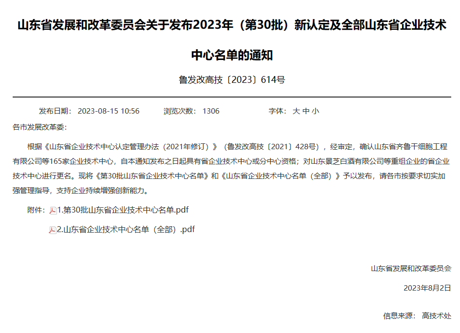 8月15日,山东省发展和改革委员会发布2023年山东省企业技术中心名单,星空在线登录官网凭借自身综合创新能力成功入选,获评山东省企业技术中心称号。