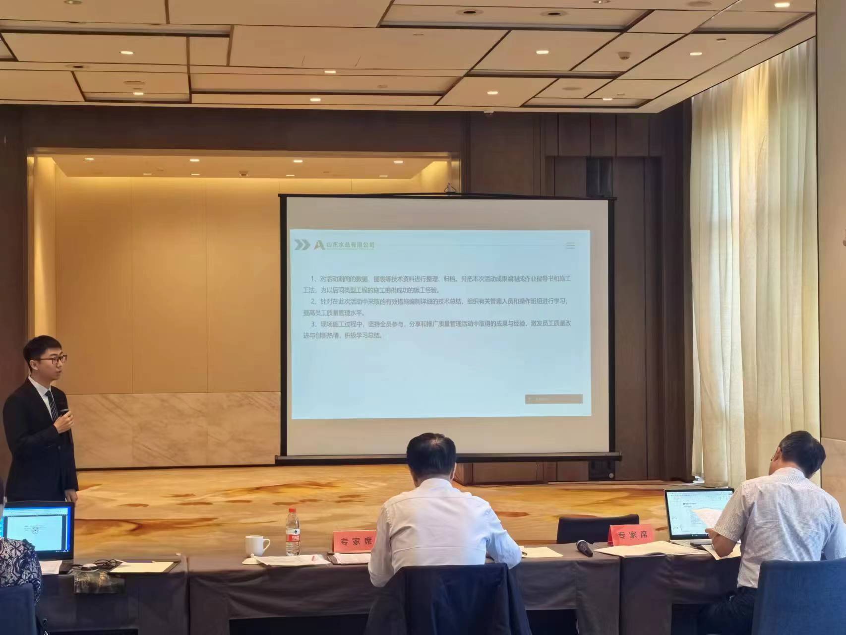 近日,中国水利工程协会2023年度水利工程优秀质量管理小组成果发布会在福州举行,山东水总第三分星空在线登录官网申报的《提高河道砼连锁块安装一次验收合格率》,第七分星空在线登录官网申报的《对称式操作平台的研发与应用》成功参与现场发布,受到了与会专家的一致好评。