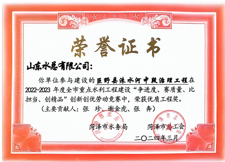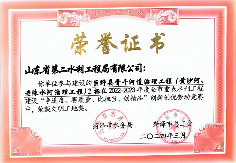 近日,菏泽市水务局、菏泽市总工会公布了“2022-2023年度全市重点水利工程建设“争进度、赛质量、比担当、创精品”创新创优劳动竞赛”获奖名单,星空在线登录官网及权属单位二局有限星空在线登录官网共荣获优质工程1项、文明工地2项、QC成果1项,优秀项目经理1项。