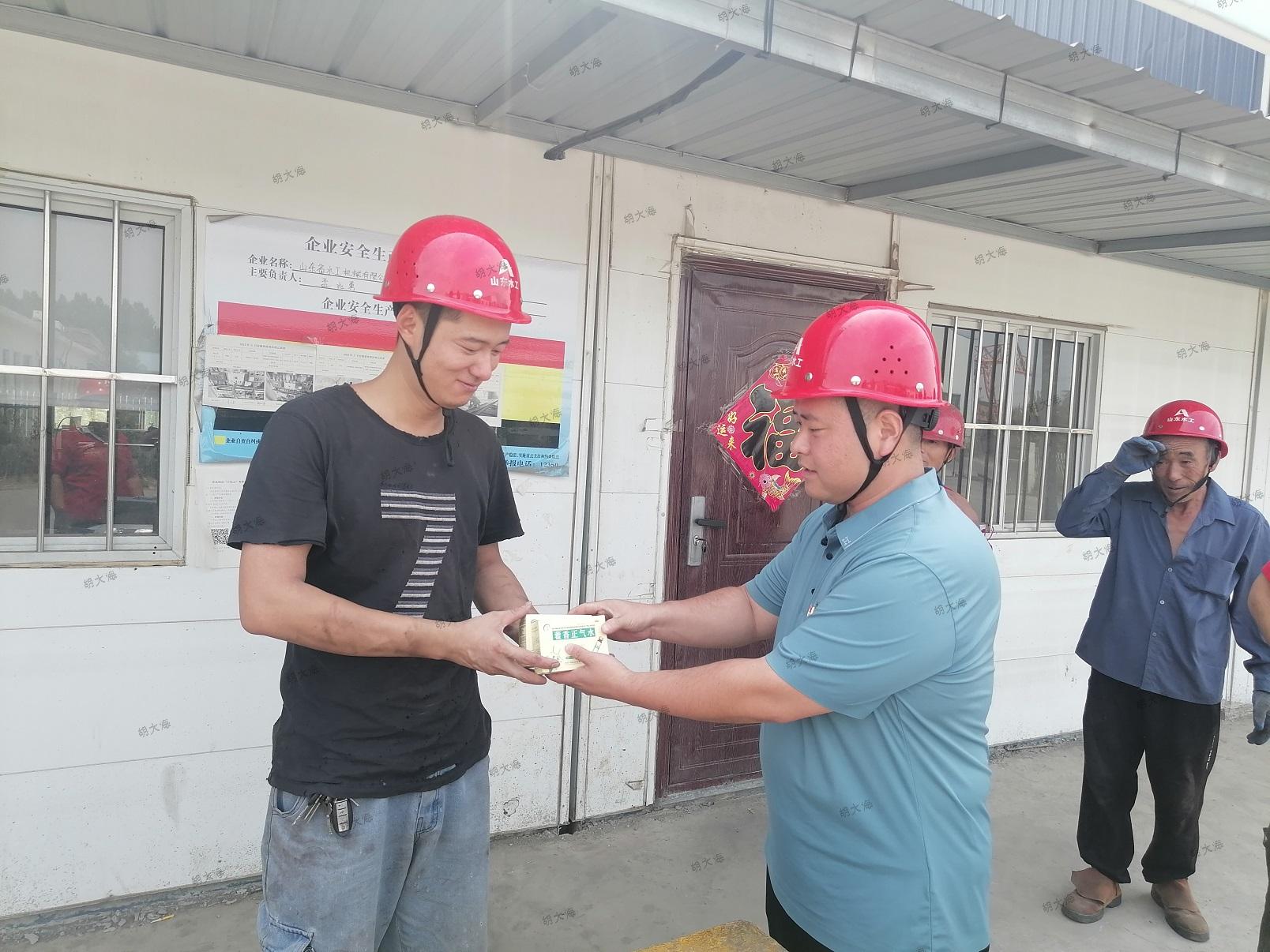 水工机械星空在线登录官网领导心系农民工,组织召开专题会议部署防暑降温工作。各部门以多形式积极落实会议精神,其中安全生产部深入生产一线,给农民工发放防暑物品,为他们送去丝丝凉意,并提醒大家夏季高温作业时要做到不疲劳上岗、不带不良情绪上岗,高高兴兴上班来,平平安安回家去,