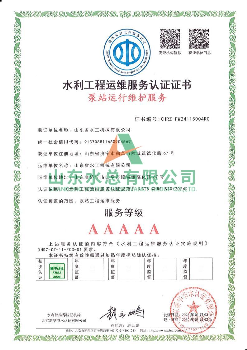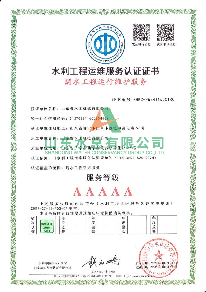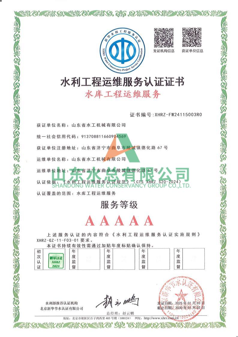 一直以来,水工机械星空在线登录官网高度重视水利工程运维服务的质量与专业性,在人员配备、技术应用、管理体系等多方面精心打磨。在认证过程中,历经严格审核,星空在线登录官网凭借扎实的运维实力、规范的服务流程以及对水利工程运维高规格的执行标准,赢得了认可。