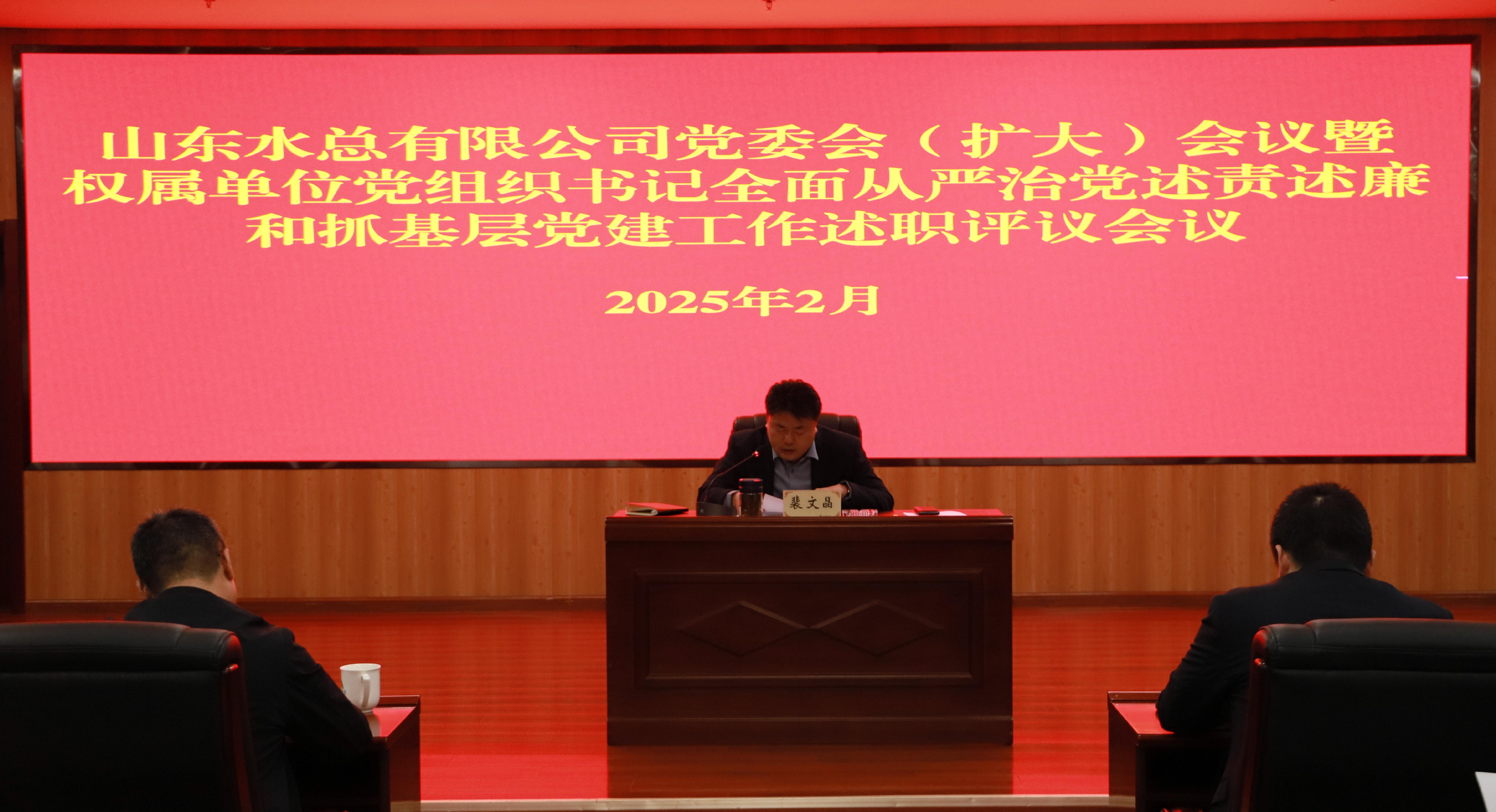 2月6日,山东水总有限星空在线登录官网召开党委(扩大)会议,分别听取权属单位党支部书记2024年度全面从严治党述责述廉和抓基层党建工作述职,并进行现场评议。山东水总有限星空在线登录官网党委书记、董事长裴文晶同志主持会议并讲话,星空在线登录官网党委班子成员及高管、总部有关部室负责人及权属单位党组织书记和基层党员代表参会。