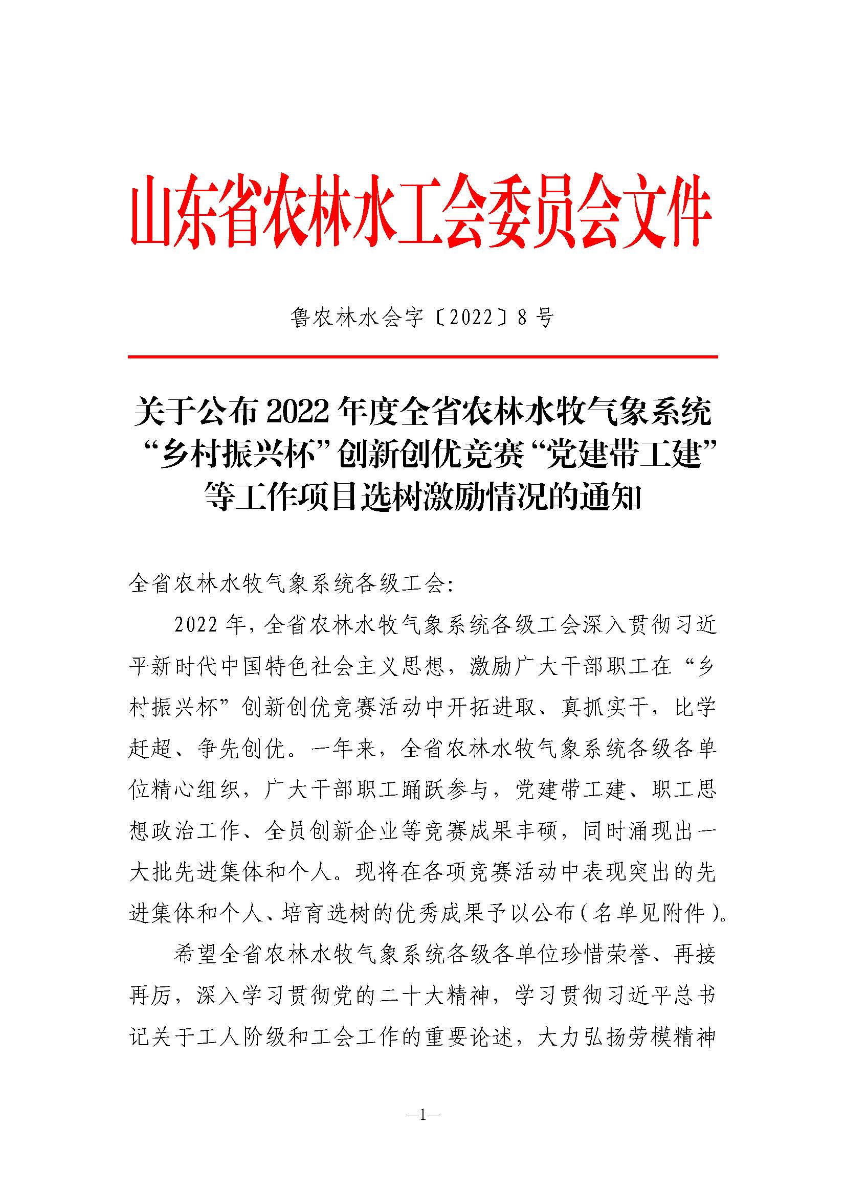 近日,山东省农林水工会委员会下发《关于公布2022年度全省农林水牧气象系统“乡村振兴杯”创新创优竞赛等工作项目选树激励情况的通知》,对涌现出的先进集体、个人和优秀案例予以通报表扬。第六分星空在线登录官网报送的《以“党建+”系列活动为抓手 实施“党建带工建项目化”管理》和基础星空在线登录官网报送的《党建带工建 携手共建》两个案例荣获“党建带工建、工建促党建”优秀案例;第二分星空在线登录官网报送的《坚持以人为本 结合实际开展职工思想政治工作》荣获“职工思想政治工作”优秀案例;刘永恩同志荣获第二届“身边的爱岗敬业榜样”;苏强、谢金虎、李云贺同志荣获“职工安全隐患排查竞赛优秀个人”。