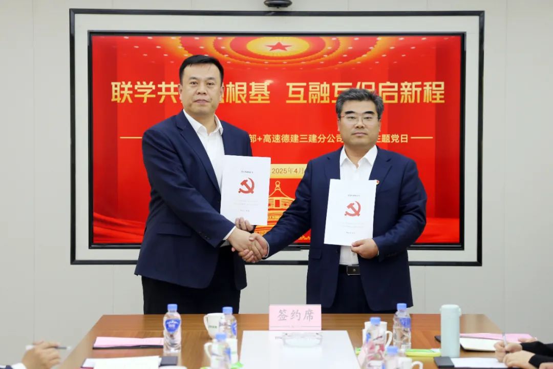 交流会上,山东水总第五分星空在线登录官网党支部书记蔡国森同志、山东高速德建三建分星空在线登录官网党支部书记李杰同志共同签订《党建结对共建合作协议》,并就支部工作开展情况进行简要介绍,对共同抓好党建共建,服务项目高质量建设进行交流。
